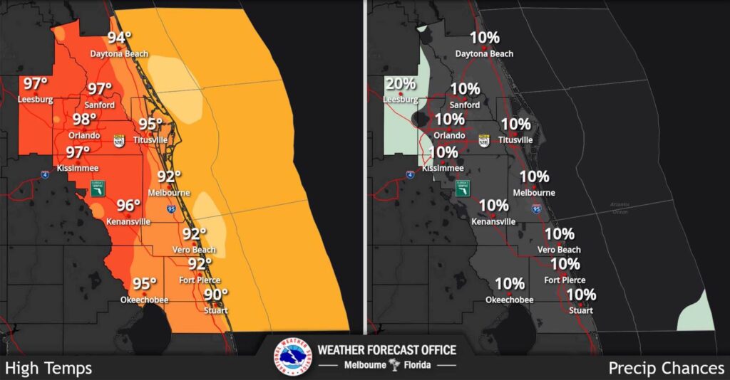 A região da Flórida Central, incluindo Orlando, entrou em alerta de calor neste domingo com sensação térmica entre 42–44 °C — níveis próximos ou acima de recordes históricos para o período. Em Orlando, o sábado registrou máxima perto de 36 °C, com umidade elevada que fez a sensação de calor subir ainda mais, sendo o dia mais quente sentido pela cidade até agora […]